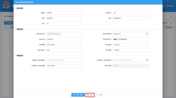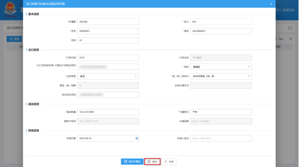 需要修改数据时,勾选需要修改的记录,点击【打开】按钮,弹出出口货物转内销证明编辑界面,进行相应字段的修改。如图: