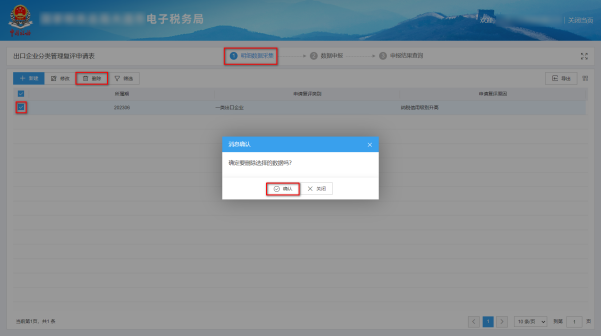 若发现申报数据有误,可将数据撤销,返回到明细数据录入阶段,进行修改,再按照其他申报向导流程重新申报。选择申报系统“其他申报向导”第五步“其他申报数据撤销”->“撤销出口退(免)税其他业务申报数据”,选择“一类企业评定申请”,输入“所属期”,点击【确定】按钮。如图: