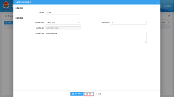 选择申报系统“其他申报向导”第一步“其他申报数据采集->出口企业分类管理复评申请”,点击【增加】按钮,录入申请复评类别、申请原因代码等内容。如图: