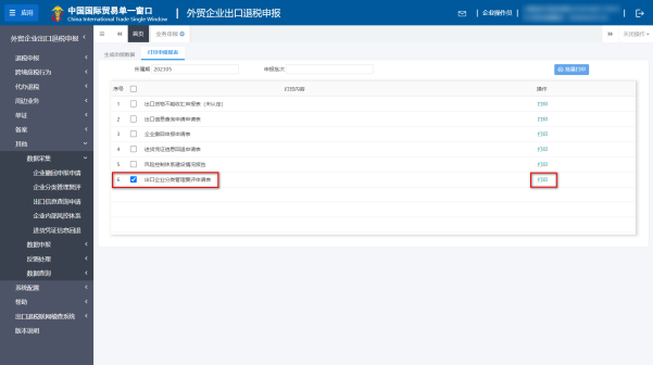 选择申报系统“其他申报向导”第三步“打印其他申报报表”,选择“出口企业分类管理复评申请”,录入“所属期”,点击【确认】按钮。如图: