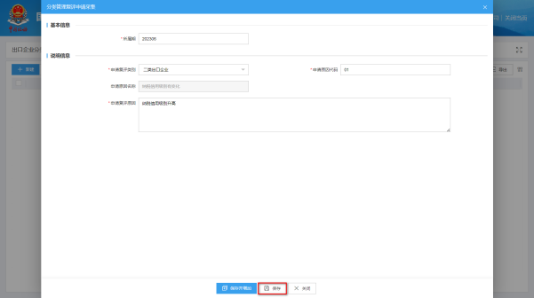 需要修改数据时,勾选需要修改的记录,点击【打开】按钮,弹出出口企业分类管理复评申请编辑界面,进行相应字段的修改。如图: