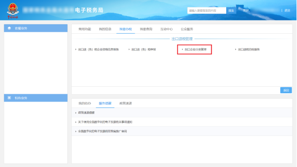 登录电子税务局后,通过“我要办税”->“出口退税管理” ->“出口企业分类管理”->“一类出口企业评定申请”,选择“在线申报”进入申报模块。如图: