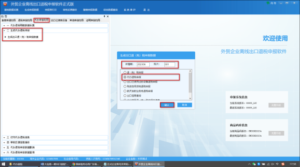 点击【生成申报数据】按钮,选择“代理出口货物证明申请”,录入“所属期”及“批次”,再点击【确定】按钮,可生成申报数据。如图: