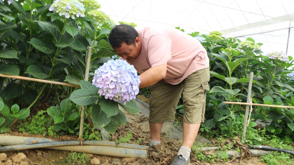 张丙生介绍,当地土壤和气候适宜种植海蓝绣球花品种,花的直径一般10厘米以上,花期长达2个月,这段时间内花色会不断变化,极具观赏性。单株每年可采摘7至8枝花,每枝花价5至10元,年销售额170万元以上。如今,昆明斗南花市及周边县市客户都找上门来订购,随着订单增多,务工群众也陆续增加,除固定用工外,季节性务工增加到30余人。