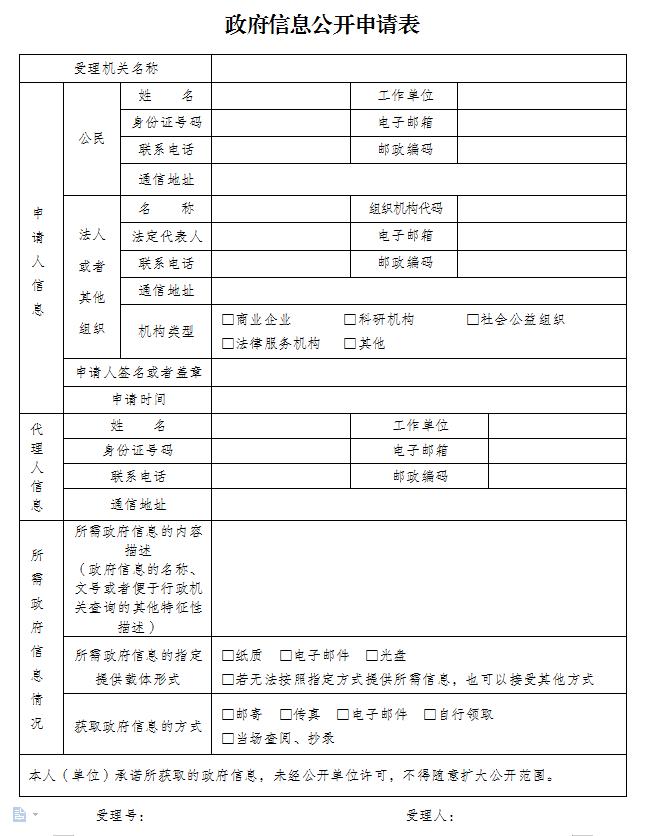 申请人须填写《政府信息公开申请表》,可在禄丰市人民政府门户网站下载电子版本(附件1:政府信息公开申请表),复制有效;不具备下载条件的,可向受理机构申请领取。